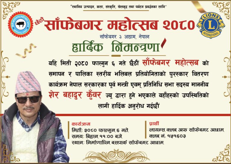 महोत्वसको समापन नेपाल सरकारका पूर्व मन्त्री एवंम प्रतिनिधी सभा सदस्य माननिय शेर बहादुर कँवरको प्रमुख आथित्यतामा समापन गरिने आयोजक लाईन्स क्लब अफ साँफेबगरले जनाएको छ ।