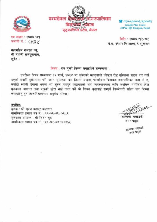 उक्त घटनाबारे श्रम, रोजगार तथा सामाजिक सुरक्षामन्त्री डोल प्रसाद अर्यालले समेत जानकारी लिएका छन् । कुवेतस्थित नेपाली दूतावाससँग मन्त्री अर्यालले मृतक श्रमिक र उनका परिवारको विषयमा जानकारी लिएका हुन् ।
