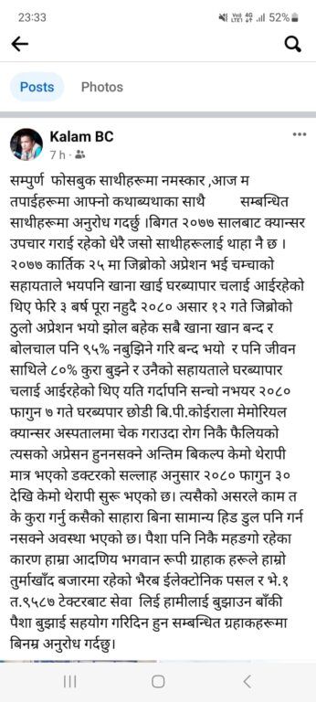 उनले भावुक हुँदै “हाम्राे तुर्माखाँद बजारमा रहेकाे भैरब ईलेक्टाेनिक पसल बाट सेवा लिनु भएका भगवान् रुपी ग्राहकहरु र भे.१ त.९५८७ टेक्टरबाट वा अन्य सेवा लिई हामीलाई बुझाउन बाँकी पैसा बुझाई सहयाेग गरिदिन हुन सम्बन्धित ग्रहाकहरूमा बिनम्र अनुराेध गर्दछु भनेर स्टाटस लेखेका छन् । ”