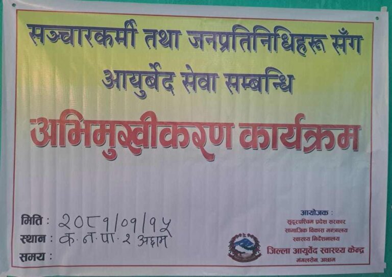 अछाम : जिल्ला आयुर्वेद कार्यालय अछामले प्रदान गर्ने सेवा विस्तारका बारेमा सरोकारवाला संगको अभिमुखीकरण कार्यक्रम कमलबजारमा सम्पन्न भएको छ । सञ्चारकर्मि तथा जनपर्तिनिधीहरुसंग आयुर्वेद सम्बन्धि अभिमुखिकरण कार्यक्रम जिल्ला आयुर्वेदको आयोजनामा अछामको कमलबजारमा संम्पन्न भएको हो । उक्त अभिमुखिकरण कार्यक्रमा जिल्ला आयुर्वेद स्वास्थ्य केन्द्रद्धारा हालसम्म उपलब्ध सेवाको बारेमा सहभागिलाइ बिस्तृत रुपमा जानकारी गराइएको थियो । आयुर्वेद उपचार पद्धतिको महत्व दिन प्रतिदिन बढ्दै गएको भन्दै कमलबजारका जनप्रर्तिनिधिहरुले आयुर्वेद स्वास्थ्य केन्द्र कमलबजारमा पनि स्थापित हुनुपर्ने माग गरेका छन । आयुर्वेद सम्बन्धि अभिमुखिकरण कार्यक्रमका सहभागी वक्ताहरुले न्युन बजेट, कम जनशक्तिका बिच पनि जिल्ला आयुर्वेद स्वास्थ्य केन्द्रले निकै प्रभावकारी र परिणाममुखि काम गरेको भन्दै गाँउगाँउमा स्वास्थ्य शिविर संचालन, जिवनशैलि व्यवस्थापनका निम्ति स्वस्थ जिवन , योगा तथा बाथ रोगका लागि स्टिम वाथ लगायतका कार्यक्रम सचालन गरि जनताका बिच लोकप्रिय बन्दै गएको बताएका छन ।
