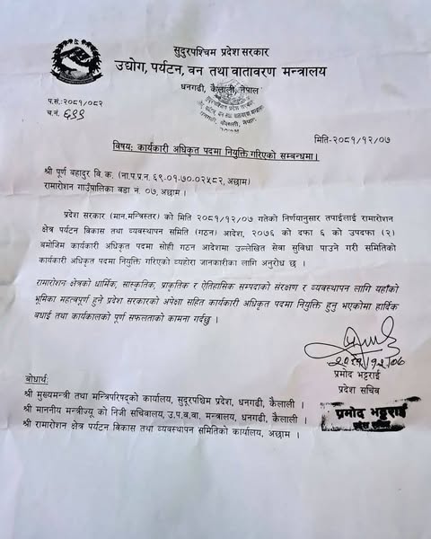 धनगढीः रामारोशन क्षेत्र पर्यटन विकास तथा व्यवस्थापन समितिको कार्यकारी अधिकृत पदमा पूर्ण बहादुर बिक नियूक्त भएका छन् । सुदूरपश्चिम प्रदेश सरकार उद्योग, पर्यटन, वन तथा वातावरण मन्त्रालयले बिकलाई कार्यकारी अधिकृत पदमा नियूक्त गरेको हो ।