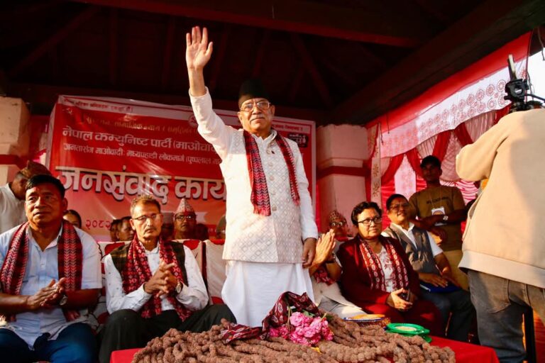 “यहाँ आउँदै गर्दा बाटोमै भीम रावलको सम्पर्क कार्यालय देखेँ,” प्रचण्डले जनसमूहलाई सम्बोधन गर्दै भने, “मैले हिजोमात्र उहाँसँग फोनमा कुराकानी गरेको थिएँ। उहाँले कार्यक्रमको सफलताको शुभकामना दिनुभयो। मैले पनि उहाँलाई भनेको छु— हामी बसेर गम्भीर कुरा गर्नुपर्ने बेला हो, तपाईं अहिले कोसँग संवाद गरिरहनुभएको छ?”