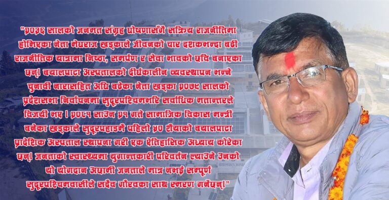 “२०३६ सालको जनमत संग्रह घोषणासँगै सक्रिय राजनीतिमा होमिएका नेता मेघराज खड्काले जीवनको चार दशकभन्दा बढी राजनीतिक यात्रामा निष्ठा, समर्पण र सेवा भावको छवि बनाएका छन्। ‘बयालपाटा अस्पतालको दीर्घकालीन व्यवस्थापन’ भन्ने चुनावी नारासहित अघि बढेका नेता खड्का २०७९ सालको प्रदेशसभा निर्वाचनमा सुदूरपश्चिमभरि सर्वाधिक मतान्तरले विजयी भए । २०८१ साउन २१ गते सामाजिक विकास मन्त्री बनेका खड्काले सुदूरपहाडमै पहिलो ‘५० शैयाको बयालपाटा प्रादेशिक अस्पताल’ स्थापना गरी एक ऐतिहासिक अध्याय कोरेका छन्। जनताको स्वास्थ्यमा युगान्तकारी परिवर्तन ल्याउने उनको यो योगदान अछामी जनताले मात्र नभई सम्पूर्ण सुदूरपश्चिमवासीले सदैव गौरवका साथ स्मरण गर्नेछन्।”