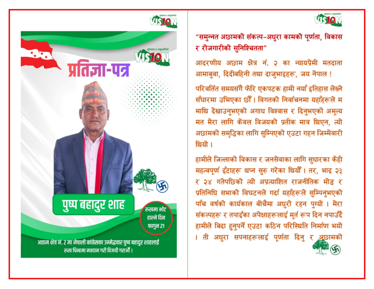 अछाम। नेपाली कांग्रेस अछाम क्षेत्र नम्वर २ का प्रतिनिधि सभा सदस्यका उम्मेदवार पुष्प बहादुर शाहले चुनावी प्रतिज्ञा पत्र सार्वजनिक भएकाे छ।