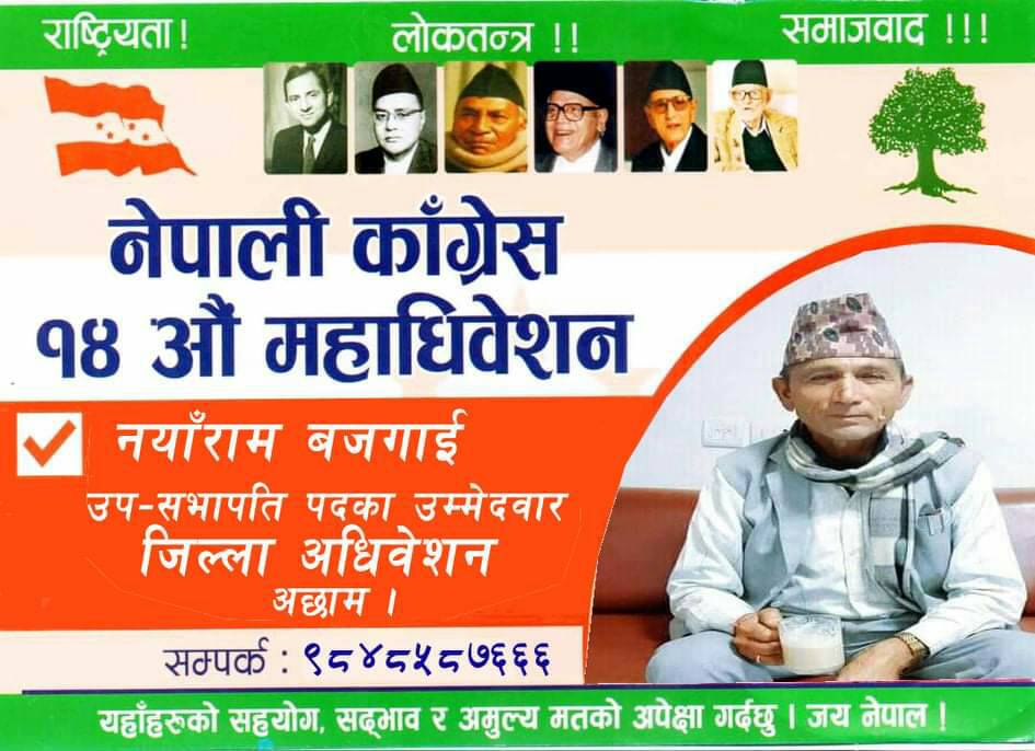 अछाम । नेपाली कांग्रेस अछामको उपसभापती पदका लागि पुराना नेता नयाँ राम बजगाँईले उम्मेद्धारी घोषणा गरेका छन् । अनुभबी तथा पाका नेताको रुपमा चिनिने नेता बजगाँईले उपसभापती पदमा रहेर कांग्रेस अछामलाई योग्दान दिन उम्मेद्धारी दिने उद्घोष गरे । आफुले पार्टीमा लामो समय देखि सक्रिय रहेर काम गरेको र त्यहि अनुभवका आधारमा पुराना र नयाँ साथीहरुको…