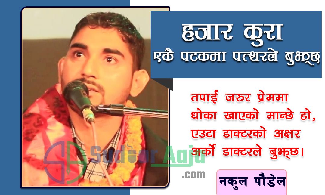 नकुल पौडेल नदिलाई नजिकबाट केवल बगरले बुझ्छ। जसरी छोरीलाई आफ्नो माईतिघरले बुझ्छ। एउटै कुरा हजारपटक भन्दा बुझ्दैन सरकार,हजार कुरा एकैपटकमा पत्थरले बुझ्छ। तपाईं जरुर प्रेममा धोका खाएको मान्छे हो,एउटा डाक्टरको अक्षर अर्को डाक्टरले बुझ्छ। जहर समेत नक्कली परेर मर्न पाएन बिचरा, यो त शहरतिरको कुरा हो शहरले बुझ्छ। कमसेकम तिमीले मलाई बुझ्न नसकेपनी,तिम्रो तस्वीरले बुझ्छ…