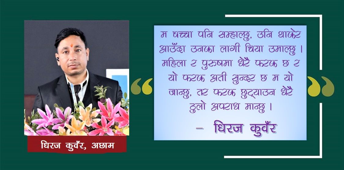 - धिरज कुवँर, अछाम हाम्रो अछाममा पुरुषलाई ’बैकान’ भन्ने गरिन्छ, बैकान जो बाबुले लगाएको ऋण कटाउला, ठुलो भएपछी बम्बै जाला नासो पठाउला, ६ महिना बर्ष दिनमा आउला, फेरी ३ देखि ४ महिना पछी फेरी बिदेसिएला । एक्ली श्रीमतिको भरमा पुरै परिवार छोडेर, जसलाई यो समाजले मेसिन भन्दा बढी कहिल्यै सम्झेन । तपाईलाई थाह छ, मेरो…
