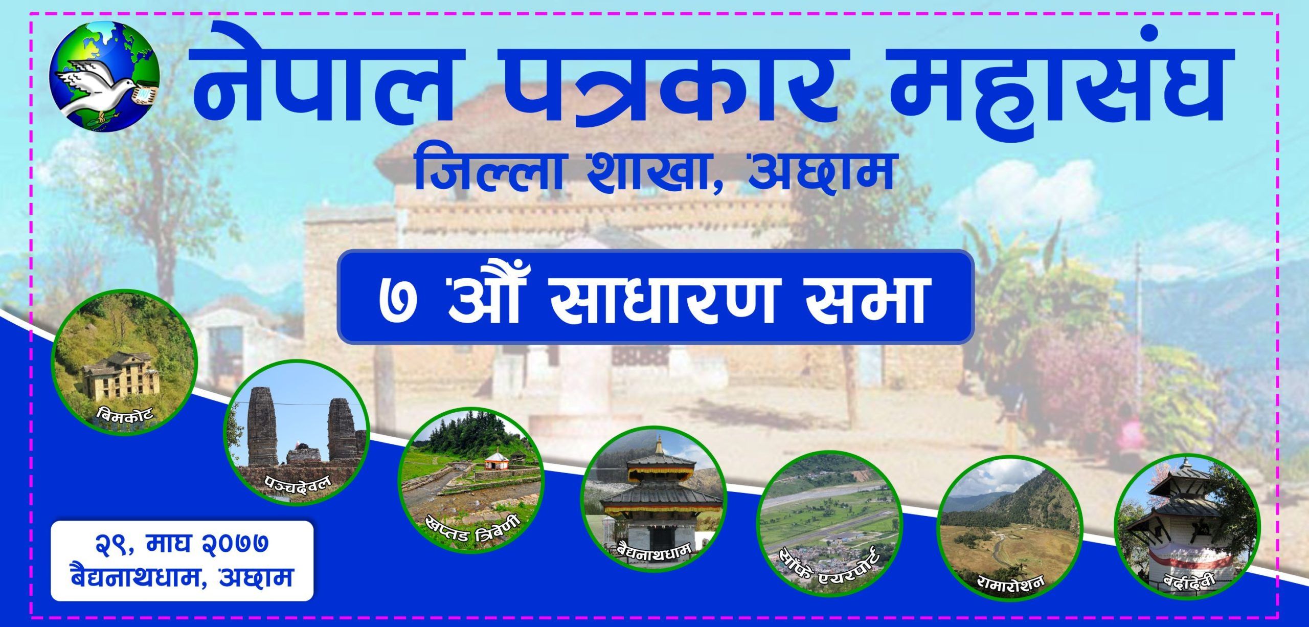 अछाम : नेपाल पत्रकार महासंघ जिल्ला शाखा अछामको साधारण सभा भोली साँफेबगरमा हुने भएको छ । शाखाको सातौँ साधारण सभाको तयारी अन्तिम चरणमा पुगेको शाखा अध्यक्ष खम्म खत्रीले बताए । अध्यक्ष खत्रीका अनुसार साधारण सभाको तयारी लगभग अन्तिम चरणमा पुगेको छ, सभा स्थलमा मञ्च व्यावस्थापन लगायतका काम आज हुनेछन् । भोलि १२ बजे नेपालमा ४…