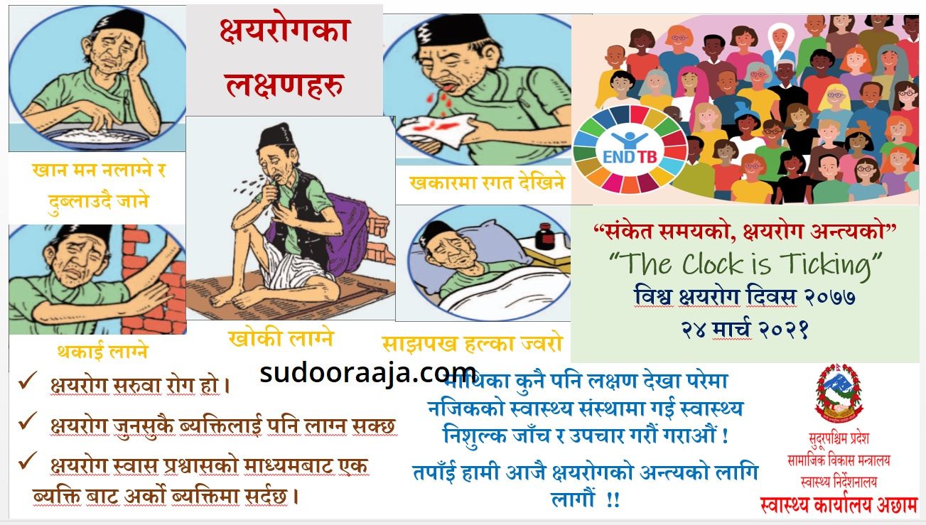अछाम । अछाम जिल्लामा ८१ जना क्षयरोगीका बिरामी रहेको तथ्यांक सार्वजनिक भएको छ । बिश्व क्षयरोग दिवसको अवसरमा सार्वजनिक तथ्यांक अनुसारमा यस आर्थिक बर्षको फागुन सम्म उक्त संख्यामा बिरामी रहेको स्वास्थ्य कार्यालय अछामले जनाएको छ । जिल्लाका पालिकागत तथ्यांक अनुसार यस आर्थिक बर्षको फागुनसम्म तुर्माखाँद गाँउपालिकामा सबैभन्दा कम १ जना र बढी साँफेबगर नगरपालिकामा १८…