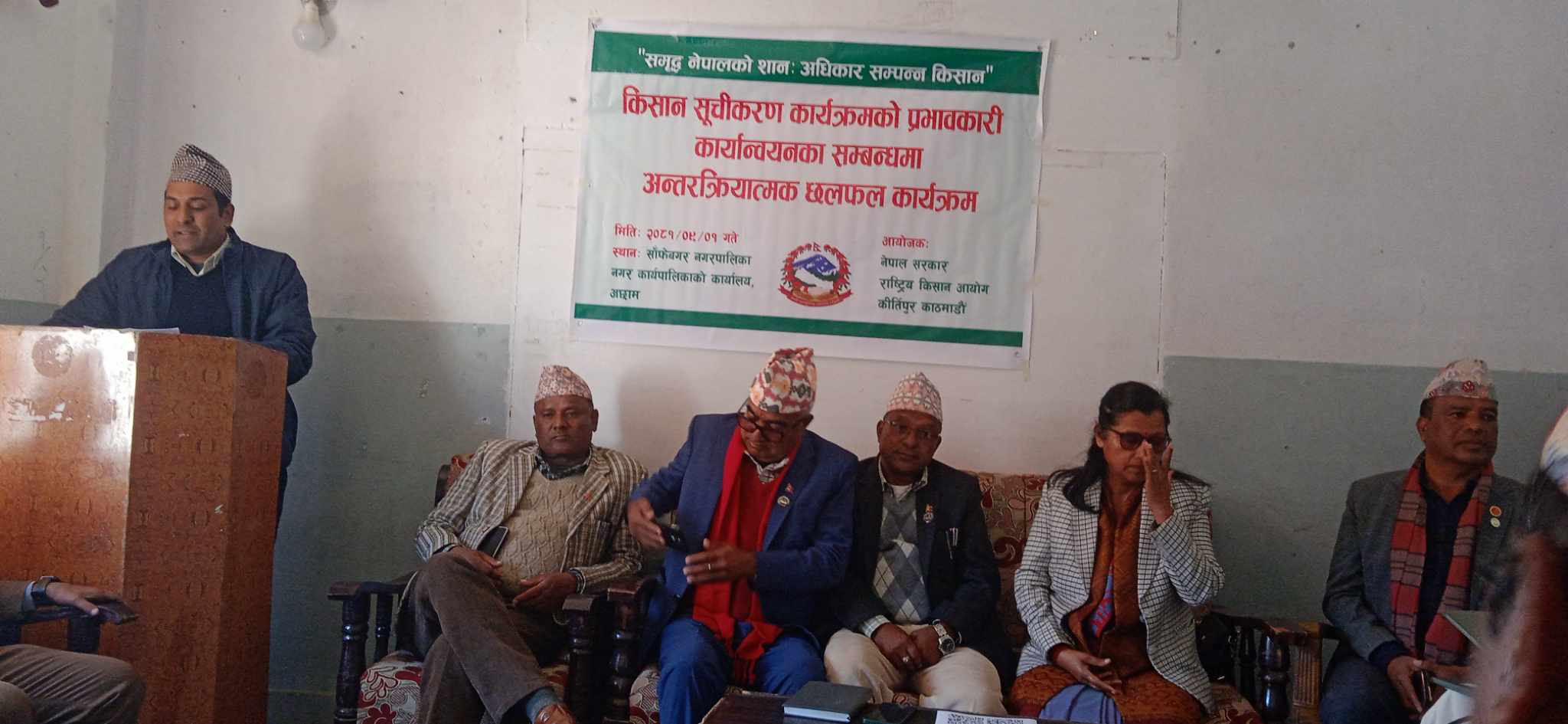 भगवती कुँवर, अछाम : किसान सुचीकरण कार्यक्रमको प्रभावकारी कार्यन्वयनका सम्बन्धमा अन्तर क्रियात्मक छलफल कार्यक्रम साँफेबगरमा सम्पन्न भएको छ । “समृृद्ध नेपालको शान,अधिकार सम्पन्न किसान भन्ने” मुल नाराका साथ राष्ट्रिय किसान आयोगको आयोगजना अन्तर्गत सुदूरपश्चिमको दोस्रो चरणको कार्यक्रम साँफेबगरमा सोमबार सम्पन्न भएको हो। पहिलो चरणको कार्यक्रम बैतडी, दार्चुला, डडेलधुरा र बझाङका जनप्रतिनिधि संग छलफल गरेर शुक्रबार…