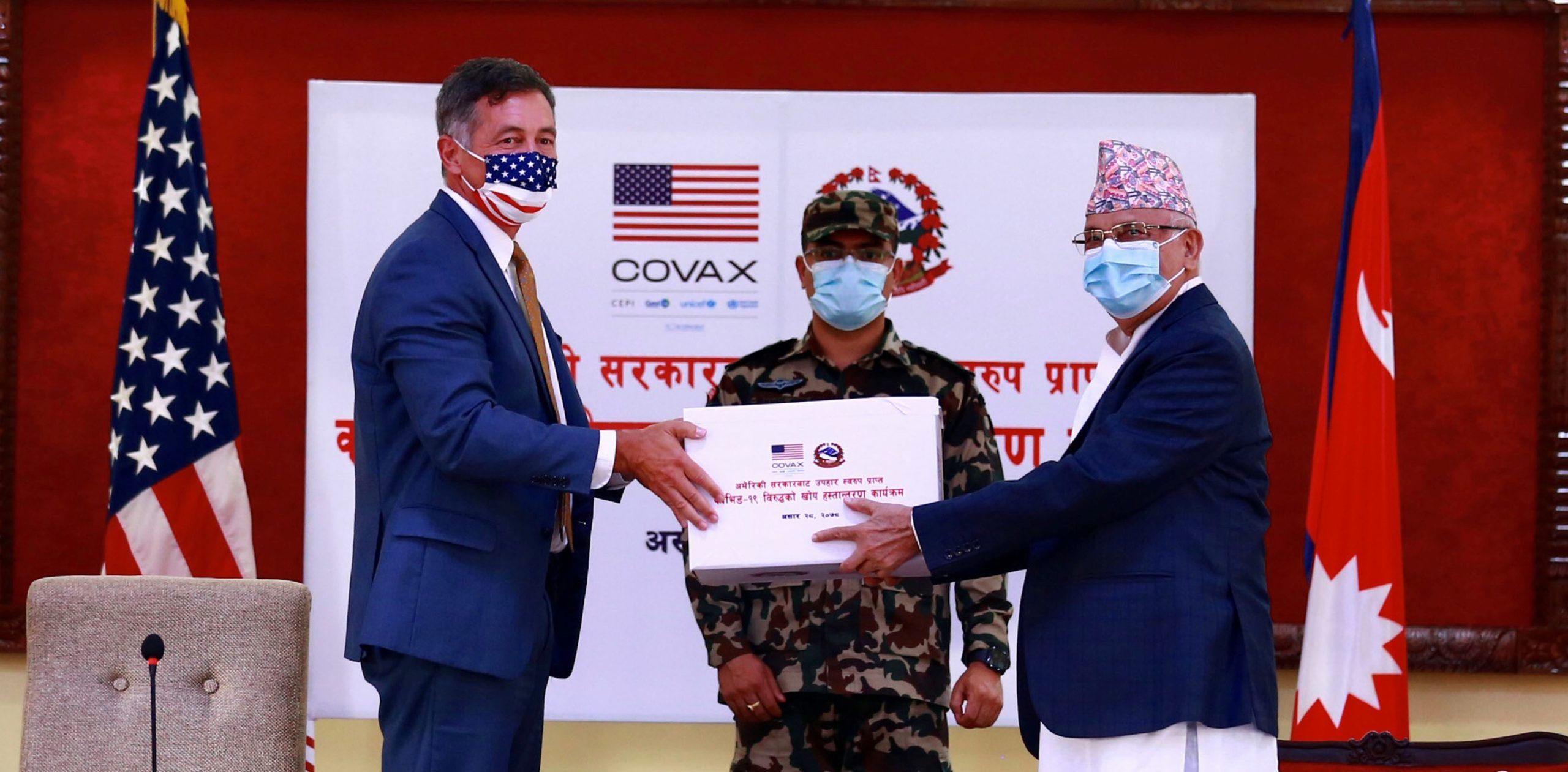 अमेरिकी सरकारबाट उपहारस्वरुप प्राप्त कोभिड–१९ विरुद्धको खोप सोमबार प्रधानमन्त्री केपी शर्मा ओलीलाई हस्तान्तरण गर्दै नेपालका लागि अमेरिकी राजदूत र्याण्डी बेरी। तस्बिर : रासस काठमाडौं– सरकारले कोरोना भाइरसविरुद्धको खोप अभियान भोलि मंगलबारदेखि पुनः सञ्चालन गर्ने भएको छ। स्वास्थ्य सेवा विभागले सबै जिल्ला स्वास्थ्य कार्यालयलाई पत्राचार गर्दै खोप अभियान सञ्चालन गर्न अनुरोध गरेको छ। भोलिदेखि भेरोसेल र जोनसन…