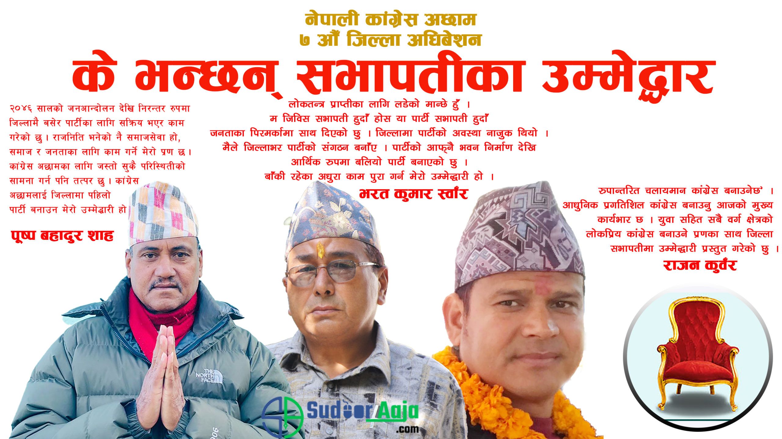 नेपाली कांग्रेस अछामको ७ औँ जिल्ला अधिबेशन शुक्रबार भोली बाट सुरु हुदैँछ । अधिबेशनको सम्पूर्ण तयारी लगभग पुरा भएको कांग्रेस अछामले जनाएको छ । कांग्रेस अछामको सभापतीका लागि ३ जना प्रतिष्पर्धी हुने लगभग पक्का पक्कि जस्तै छ । अधिबेशनको पूर्व सध्यामा सुदूरआजले तपाईको उम्मेद्धारी किन भनेर तिनै जना उम्मेद्धारलाई प्रश्न गरेका छौँ । भरत कुमार…