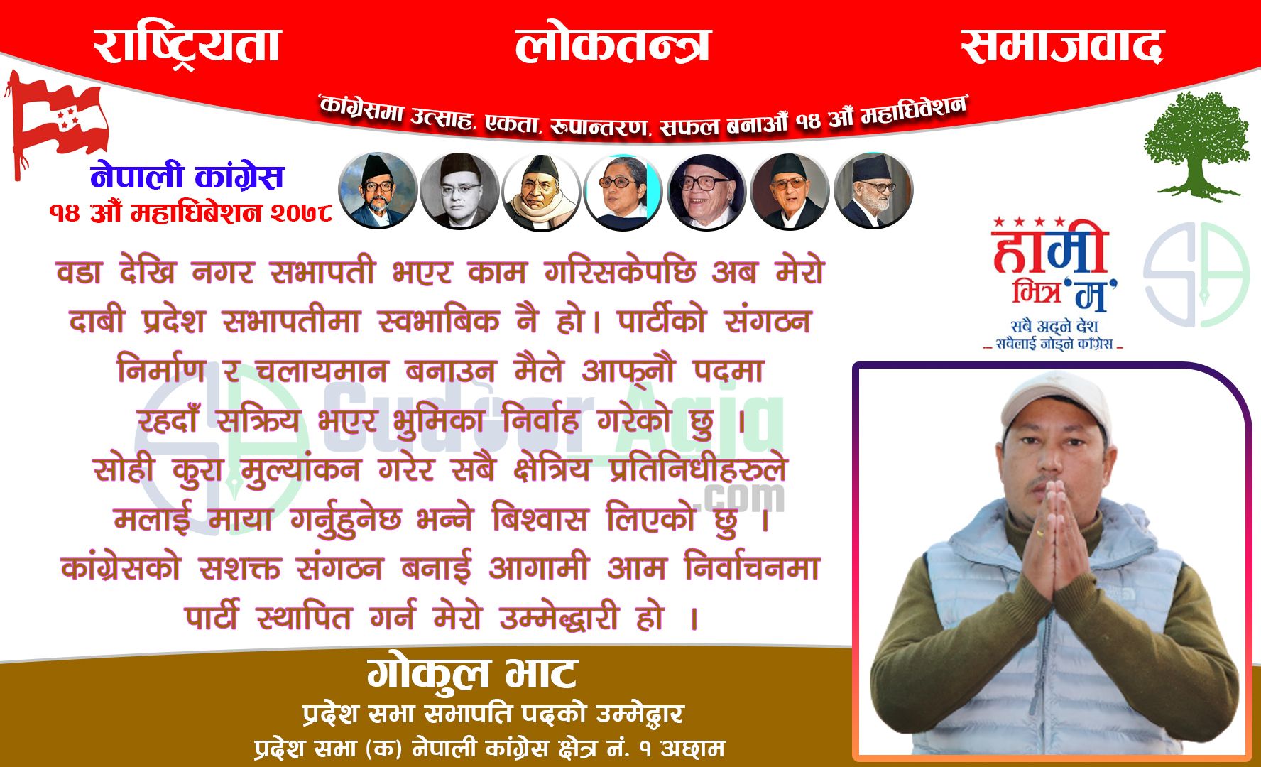 'यो बेला हामी चुक्यौँ भने कांग्रेस चुक्नेछ, तर्सथ विचार पुर्याएर नेतृत्व चयन गर्न उम्मेद्धार भाटको अपिल' अछाम । नेपाली कांग्रेस साँफेबगर नगर कार्य समितीका निर्वतमान सभापती गोकुल भाटले आफुर्ला अछाम क्षेत्र नं. १ प्रदेश सभा (क) को सभापती पदको रुपमा अघि सारेका छन् । प्रदेश सभा अन्र्तगत साँफेबगरका १४ र चौरपाटी गाँउपालिकाका ७ वडामा कांग्रेसको…