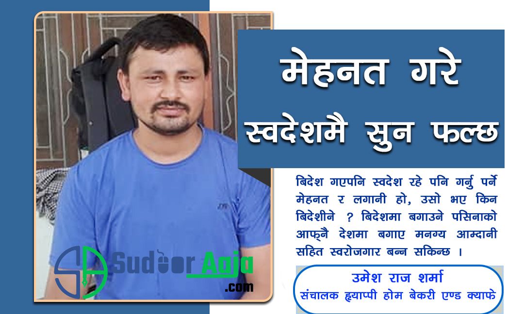 अछाम : जिल्लाको साँफेबगर नगरपालिका वडा नं. ६ भागेश्वरका यूवा उमेश शर्माले सुदूरपश्चिम प्रदेशको अस्थायी राजधानी धनगढीमा बेकरी उद्योग संचालन गरिरहेका छन् । बिदेशमा बगाउने पसिनाको लगानी स्वदेशमै गरे आफ्नै देशमा सुन फल्छ भन्ने भनाईलाई आत्मसाथ गर्दै व्यावसायमा लागेको उनको तर्क छ । ७ बर्ष गैर सरकारी संस्थामा जागिर गरेका शर्मा जागिर छाडेर व्यावसायमा लागे…
