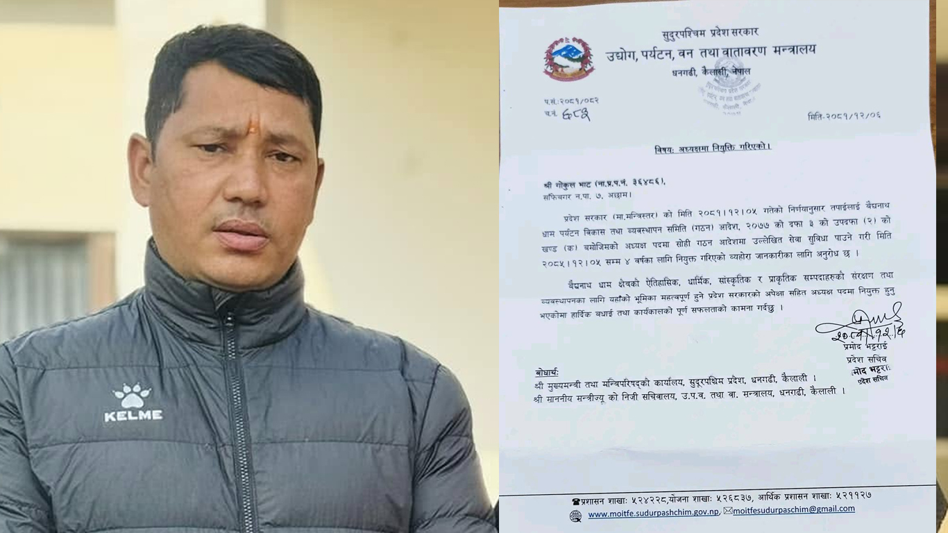 अछाम : बैद्यनाथ धाम पर्यटन विकास तथा व्यवस्थापन समिति अध्यक्षमा गोकुल भाट नियूक्त भएका छन् । साँफेबगर ७ निवासी भाटलाई सुदूरपश्चिम प्रदेश सरकार उद्योग, पर्यटन, वन तथा वातारण मन्त्रालयले अध्यक्षमा नियूक्त गरेको हो । बैधनाथ धाम पर्यटन विकास तथा व्यवस्थापन समिति (गठन) आदेश २०७७ को दफा ३ को उपदफा (२) को खण्ड (क) बमोजिम अध्यक्ष…