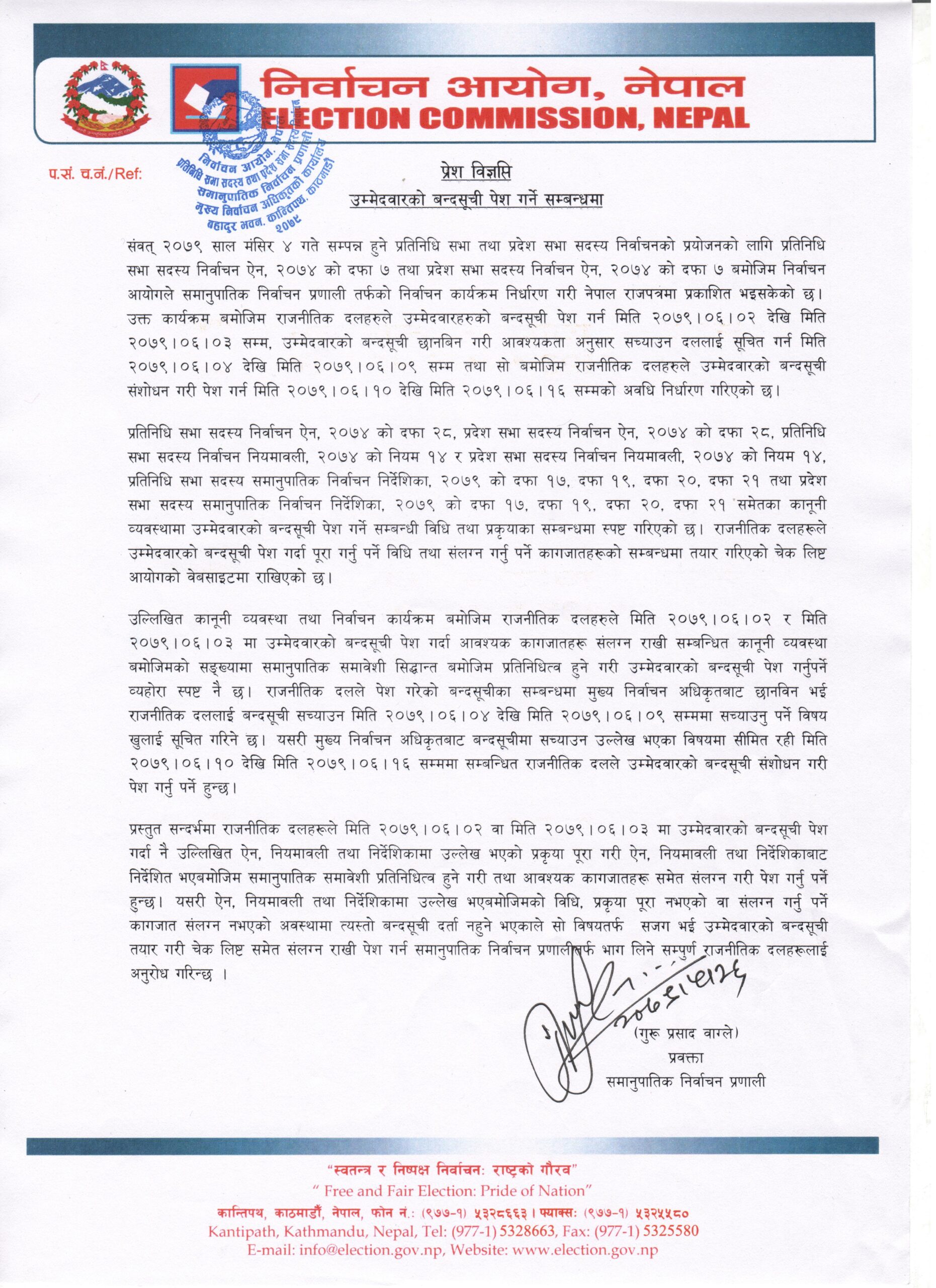 काठमाडौं: निर्वाचन आयोगले समानुपातिकतर्फको बन्दीसूची बुझाउने समय असोज २ र ३ गतेलाई तोकेको छ । आइतबार निर्वाचन आयोगले मंसिर ४ गते हुने प्रदेशसभा तथा प्रतिनिधिसभा निर्वाचनको समानुपातिकतर्फको निर्वाचन कार्यतालिका सार्वजनिक गरेको हो । असोज २ देखि ३ गतेसम्म दलले उम्मेदवारको बन्दसूची आयोगमा पेश गर्नुपर्नेछ आयोगले सूचना जारी गर्दै जनाएको छ । उक्त बन्द सूचीमाथि आयोगले…